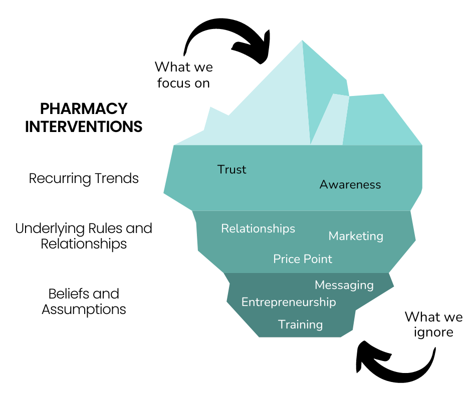 In addition, we created systems maps focused on the specific ways that pharmacies and community health workers are connecting people with eyeglasses. We dug beneath the surface to trace the impact of recurring trends, underlying rules and relationships and beliefs and assumptions in these contexts on eyeglass distribution and uptake.