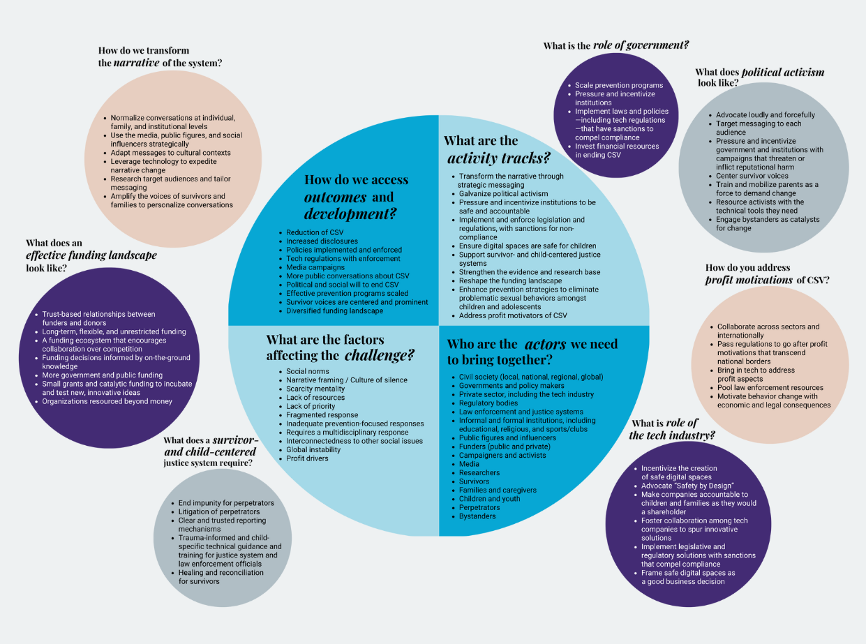 Ending CSV requires—at minimum—building multidisciplinary teams and collaborative communities, normalizing conversations on a topic people prefer not to speak about, ensuring survivors’ voices are centered (and that they and their families have the resources they need to heal and demand accountability), engaging governments to fund and scale prevention programs, developing the political will to pass legislation that compels institutional accountability (including regulating the tech industry), and strengthening the infrastructure of the field through funding and other resources.